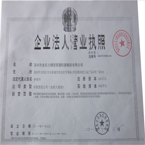 深圳市金實(shi)力(li)精密(mi)研磨機器(qi)制造有限公(gong)司(si)的企業法(fa)人營(ying)業執(zhi)照給(gei)客戶提供參考依據。金實(shi)力(li)公(gong)司(si)是經深圳市工商(shang)局依法(fa)批準進行經營(ying)生產(chan)(chan)與銷售的合法(fa)、正規企業,請(qing)大家(jia)放心購買我公(gong)司(si)設備產(chan)(chan)品。